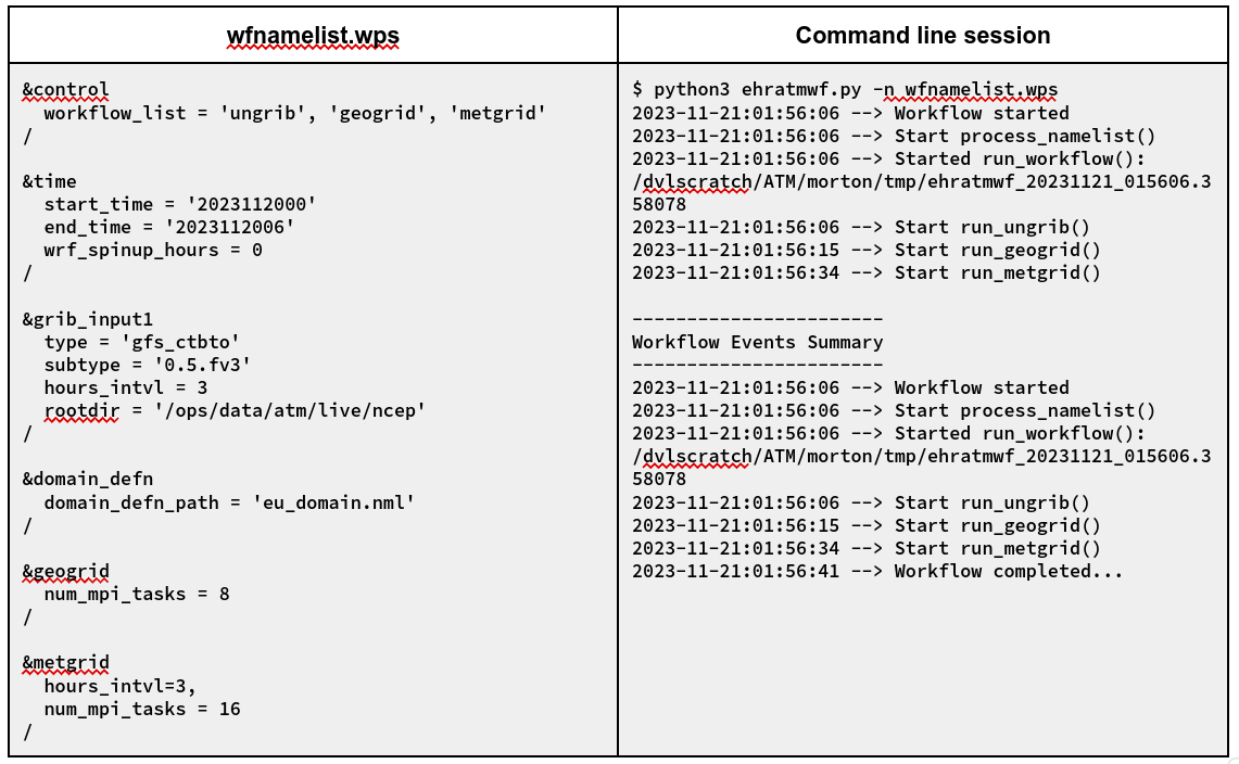 The underlying layers simply provide a collection of plug and play components that can be arranged in any way that a programmer would like to create a variety of NWP and ATM applications. This is where our targeted top-level ehratmworkflow layer comes in. It relies on the fact that the robust components it needs are available in the underlying ehratm layer and provides the “plumbing” needed to arrange the ehratm components as dictated by a user-supplied workflow namelist (wfnamelist). The ehratmworklow layer contains a large collection of wfnamelists which can be tested all at once in batch mode to ensure that they all work. As each one is invoked, it is providing additional testing of the underlying ehratm and nwpservice layers. The following provides a simple illustration that all of this abstraction has ultimately provided to the user, who simply invokes ehratmwf.py, supplying workflow requirements in a namelist (see Workflow Namelist (wfnamelist) Reference Document).