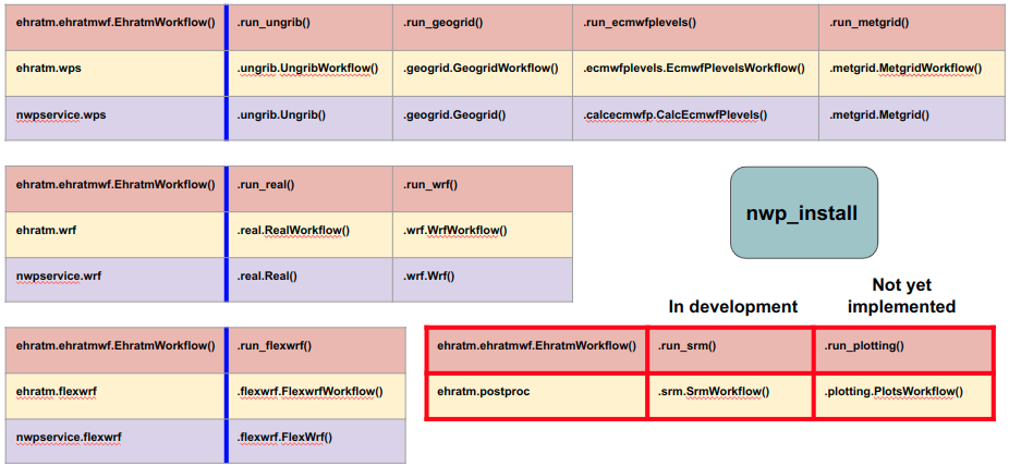 The ehratmworkflow layer is but one of an infinite number of applications that could be built, and it reflects the perceived goals of the planners and the developers in the context of supporting a flexible collection of NWP components for the primary goal of running WRF simulations to produce custom meteorological fields inputs for subsequent Flexpart WRF ATM simulations.